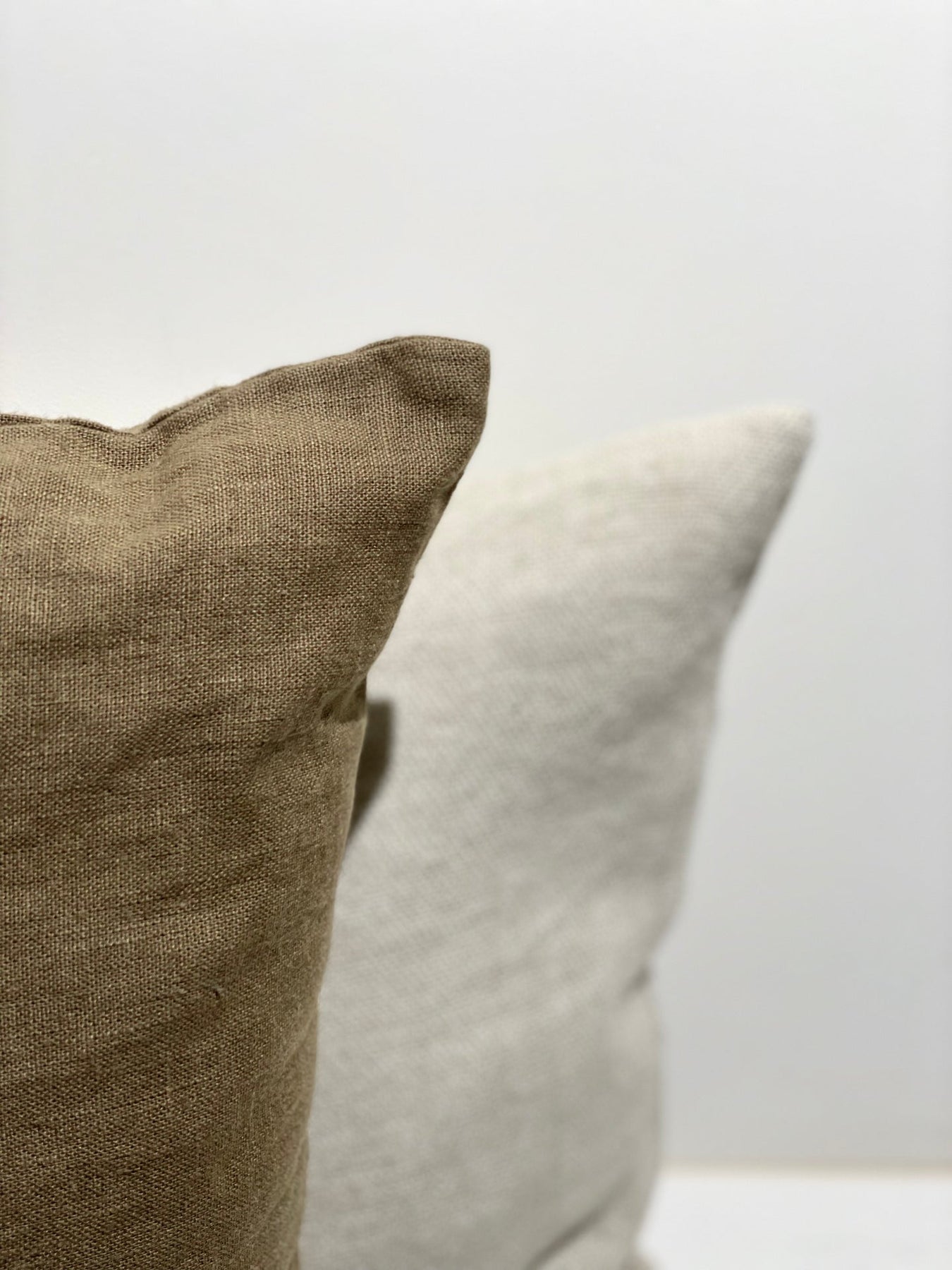 Ons tarwekleurige kussen is vervaardigd uit geweven linnen van zware kwaliteit, gewassen en zijdezacht. Het heeft een verborgen rits aan de onderkant voor een strakke afwerking. Elke kussenhoes wordt met de hand gemaakt, en de linnen stof is op een milieuvriendelijke manier geverfd, wat resulteert in een prachtige, levendige kleur met subtiele variaties in de stof.