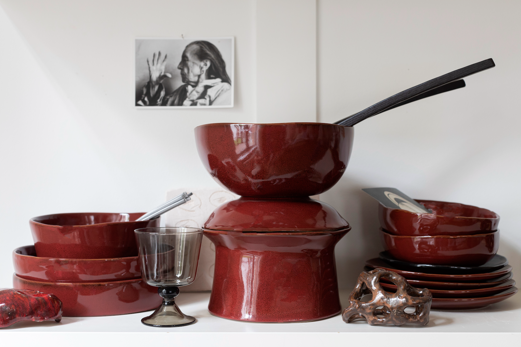 La Mère, de eerste servieslijn in keramiek van Marie Michielssen, is een liefdevolle ode aan de (groot)moederfiguur en aan de vrouw in het algemeen. Het servies oogt een tikkeltje nostalgisch maar is in veel opzichten vernieuwend door de verticale opbouw. Elke vorm is uniek en met de hand geboetseerd. Alle stukken worden afgewerkt met een glazuur in gebroken wit of een warm donkerbruin, bijna zwart. Als derde, contrasterende kleur koos Marie voor een krachtig Venetiaans rood. De ontwerpster koos die kleuren ook bewust om een mix & match te creëren van wit met donkerbruin of rood met donkerbruin.