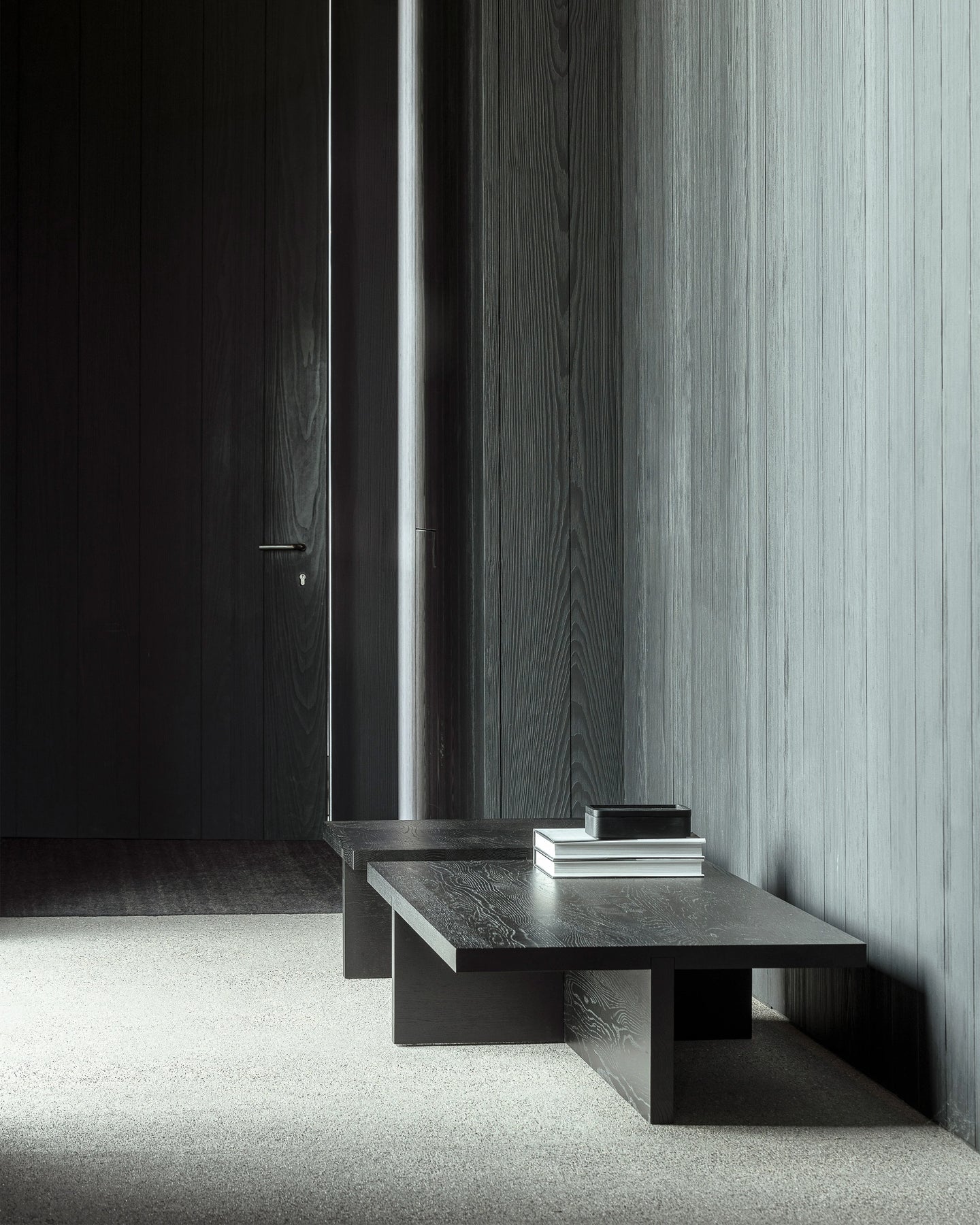 De tafels zijn gemaakt uit massief zwart of cognac getint eikenhout, wat zorgt voor een zeer warme uitstraling.